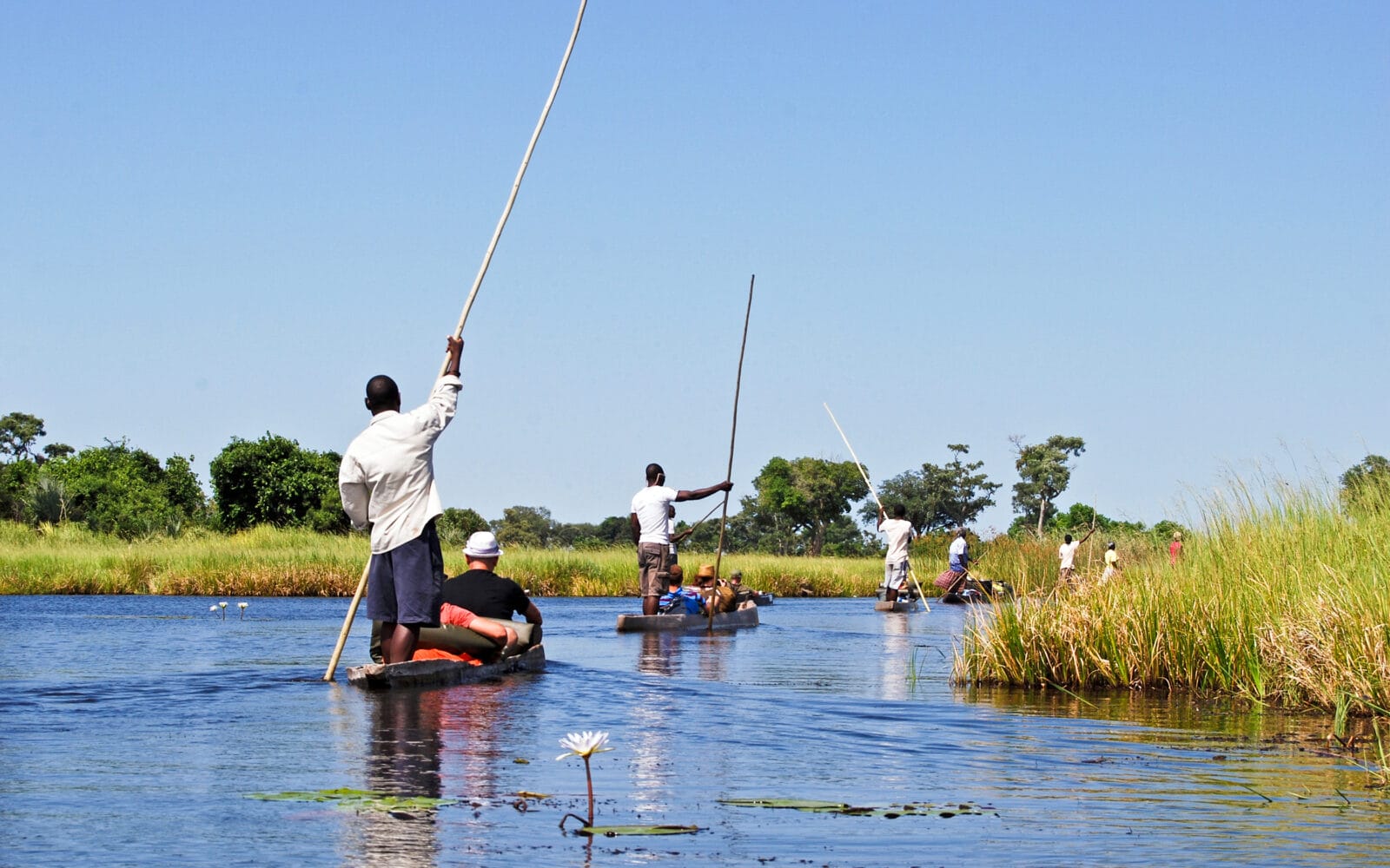 Unternimm eine spannende Mokorofahrt im Okavango Delta, dem wohl tierreichsten Gebiet Botswanas. Mit dem traditionellen Einbaumboot passierst Du die kilometerlangen Strecken – und hältst Ausschau nach wilden Tieren! Der Chobe Nationalpark imponiert mit seinem gigantischen Chobe Fluss. Und am Ende eines aufregenden Safari-Tags ziehst Du dich in Deine Unterkunft zurück: Gemütliche Camps oder luxuriöse Lodges stehen zur Auswahl.