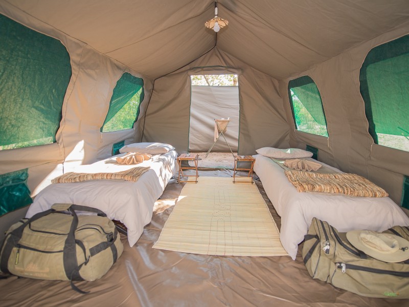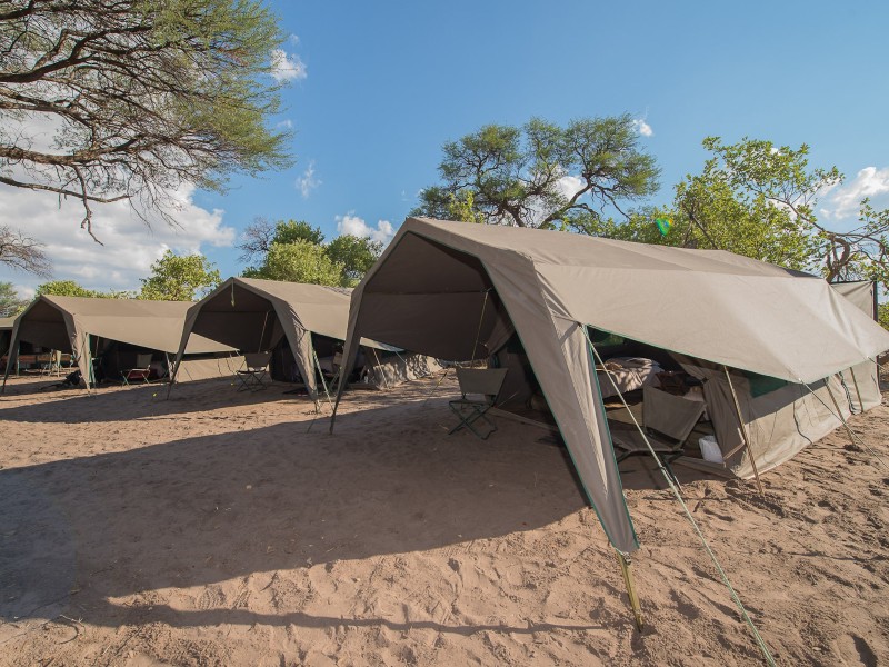 Feststehende Zelte im privaten Busch-Camp mit Campingtoilette und Eimerdusche