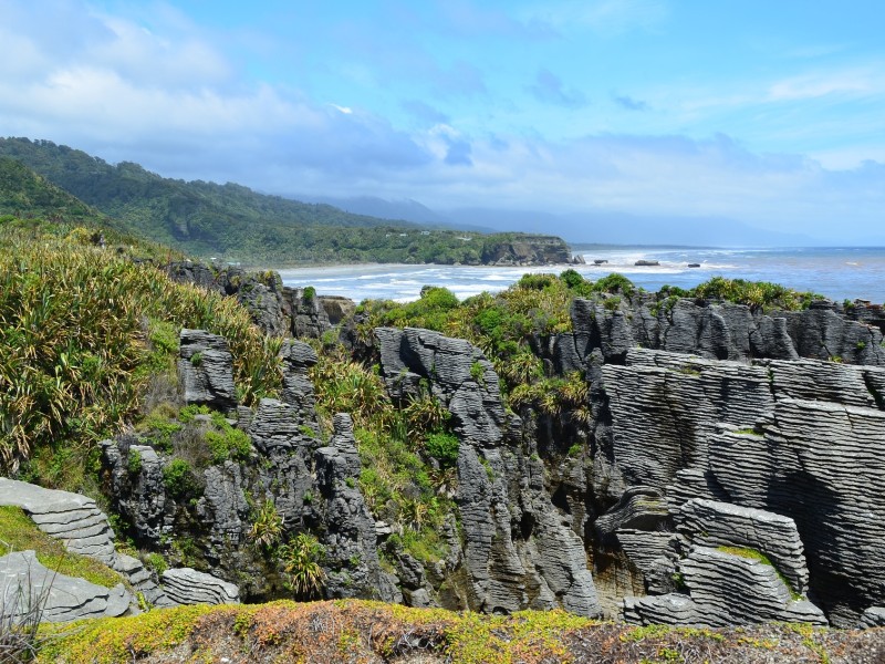 Die vielleicht berühmteste Attraktion von Punakaiki sind die Pancake Rocks, malerische Kalksteinformationen, die an Pfannkuchen erinnern, und die Blaslöcher, die Wasserströme in die Luft schicken. Diese kleine Gemeinde ist Teil des Paparoa-Nationalparks, der eine epische Küstenlandschaft und viele interessante Naturformationen wie die Punakaiki-Höhle beherbergt - man sollte nur unbedingt nachts besuchen, um die Glühwürmchen zu sehen.