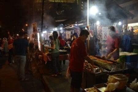 Am besten hat uns dabei Lau-Pasat gefallen: Neben einer kleinen Markthalle mit typisch asiatischem Foodcourt wird (mitten in Downtown und zwischen den Hochhäusern!) jeden Abend ab 19 Uhr eine Straße gesperrt. Auf einfachen Plastikstühlen und -tischen kann man dort ganz zwanglos frische Satay-Spieße, Tiger-Bier und andere asiatische Köstlichkeiten zu günstigen Preisen essen und trinken. Eine Straße in der Innenstadt zu sperren ohne ein Verkehrschaos zu verursachen oder wütende Autofahrer auf den Plan zu rufen würde bei uns wohl eher nicht funktionieren 😀