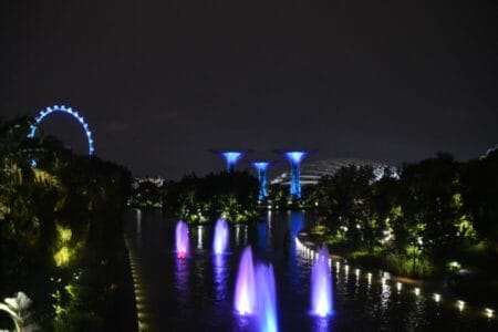 Ein besonderes Highlight sind auch die Lichtershows jeden Abend am Marina Bay sowie bei den Gardens by the Bay. Wir hatten leider etwas Pech mit dem Wetter, sodass der Rundgang zwischen den Bäumen wegen schwerem Gewitter geschlossen war. Trotzdem lohnt sich der Anblick besonders im Dunkeln wenn der ganze Park beleuchtet ist, selbst wenn man es wie in unserem Fall nur von unten sehen konnte.