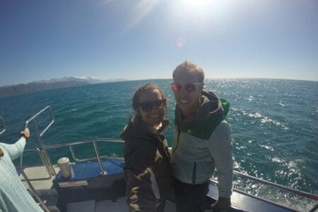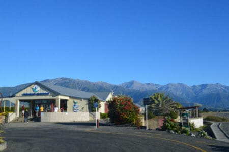Nach einer ruhigen und erholsamen ersten Nacht im neuen Camper machten wir uns dann früh um 7 Uhr auf Richtung Kaikoura und zu unserer Whale Watching Tour. Als wir uns im Vorfeld darüber informiert hatten, wurde dabei immer wieder vor Seekrankheit aufgrund der teils rauen See gewarnt. Doch wir wachten bei strahlendem Sonnenschein und ruhig wirkendem Meer auf, sodass wir diese Sorge bei Seite wischten. In der Whale Watching Station angekommen, bestätigten die freundlichen Mitarbeiter unsere Vermutung, wiesen aber daraufhin, dass die Boote sehr hohe Geschwindigkeiten erreichen können und man daher trotzdem gerne vorbeugen könne. Wenn man selbst nichts dabei hat, versorgt einen die Crew auch gerne mit Reisetabletten.