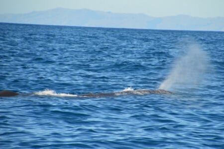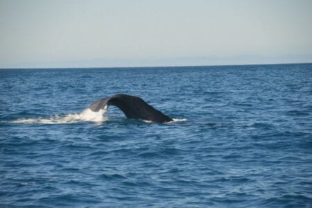 Schon nach kurzer Zeit erreichten wir dann eine Stelle, an der ein Wal vermutet wurde. Kurzerhand angehalten, war es spannend mit anzusehen, wie der Kapitän selbst mit Echolot von rechts nach links huschte, um den Wal zu orten. Und siehe da, die Suche war erfolgreich. Direkt vor uns trafen wir auf einen Wal, der an der Wasseroberfläche seinen nächsten Tauchgang zur Beutejagd vorbereitete. Wir gingen also raus und versammelten uns entlang der Reling oder oben auf dem Beobachtungsdeck „im ersten Stock“. Einige Minuten konnten wir dabei aus nächster Nähe die enormen Abmessungen dieses Säugetiers bestaunen. Dann streckte er uns standesgemäß seine riesige Flosse entgegen und tauchte in die Tiefen des Meers ab. Aber da hatte die Crew bereits den nächsten Hinweis auf einen weiteren Wal vom Schwesterboot bekommen. Bevor dieser also abtauchen konnte zögerte der Kapitän nicht lange, bat uns alle sich gut festzuhalten und steuerte zielsicher zur nächsten Stelle.