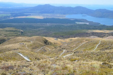 Wer davon ausgeht, dass der Weg ab dann einem monotonen Abstieg gleicht, der wird erfreulicherweise enttäuscht. Man läuft an dem wunderschönen Blue Lake vorbei und hat zudem immer wieder beeindruckende Ausblicke auf die Vulkanlandschaft, die man zuvor zu Fuß passiert hat. Das letzte Stück hinter dem Blue Lake führt dann entlang gut ausgebauter Serpentinen die 1.000 Höhenmeter wieder runter. Sicherlich scheint es einem irgendwann dann doch ein wenig monoton. Das liegt allerdings nicht an der immer noch spektakulären Aussicht auf die Umgebung und das Lake Taupo liegt, sondern viel mehr an der Tatsache, dass man den Car Park an der Ketetahi Road bereits sehen kann, dieser aber schier endlos weit weg zu sein scheint. Auch wenn die Knie dann doch ein wenig schmerzten, hieß es Zähne zusammenbeißen und die letzten Kilometer hinter uns bringen. Die letzten 45 Minuten läuft man dann sogar noch durch schattigen Regenwald und entlang eines schönen Flusslaufes, bevor man dann wirklich irgendwann den 19. Kilometer und den Car Park erreicht hat. Unten angekommen, waren die Wasserflaschen leer, der Proviant aufgebraucht, die Klamotten staubig und die Füße schmerzten auch ein wenig. Aber wir waren glücklich und stolz, diese beeindruckende Tageswanderung gemeistert zu haben!