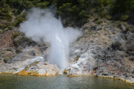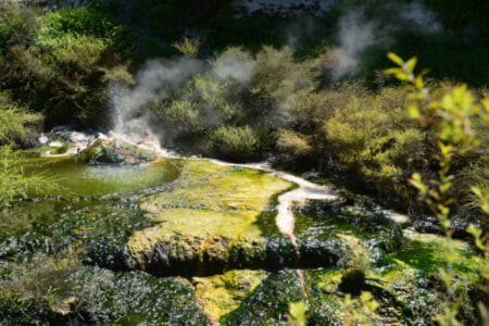 Für uns stand eine Wanderung mit kombinierter Bootstour auf dem Programm. Der knapp zweistündige Wanderweg verläuft dabei entlang verschiedener, skurrilster Landschaften durch das Tal bis hin zum größten Heißwassersee der Welt, dem Lake Rotomahana. Der Weg offenbart Ausblicke auf den Regenwald, Bachläufe mit Ablagerungen in den buntesten Farben bis hin zu kleineren Seen. Das alles galt es unterwegs zu entdecken. Im Vorfeld wurden wir mit einer Broschüre inklusive Erklärungen zu dem Naturschauspiel ausgestattet. Dampf stieg über den Wasseroberflächen empor und heiße Quellen sprudelten entlang rot-gelber Felskanten, die mit üppigem Farn überwachsen waren. Es schien fast so, als hätte sich erst kurz vor unserem Besuch der letzte Dinosaurier aus diesem vorzeitlichen “Spa” in den dichten Regenwald zurückgezogen und uns das Gebiet überlassen. Je tiefer wir ins Tal wanderten, desto mehr verschlang uns diese Welt in sich. Sprudelnde Geysire und Rauch aus der Erde begleiteten uns auf unserer Zeitreise.
