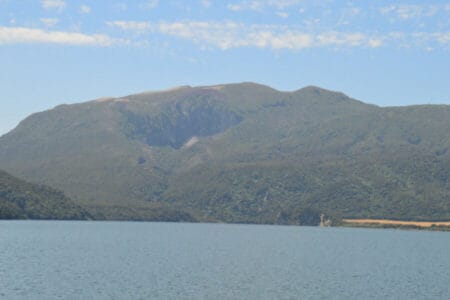 Die zwei Stunden vergingen dabei wie im Flug. Schon bald erreichten wir den Endpunkt unseres Fußmarsches, Lake Rotomahana. Dort erwartete uns bereits ein Ausflugsboot, mit dem wir 45 Minuten lang über den See schipperte. Der Skipper versorgte uns mit einer zweiten Broschüre, die allerhand Infos für uns bereithielt. Der See bestand bis 1886 aus zwei einzelnen kleineren Seen. Diese verschmolzen nach einem gewaltigen Ausbruch des hiesigen Vulkans zu einem großen See. Im Hintergrund thront der Mount Tarawera als Mahnmal dieser unvorstellbaren Naturgewalt. Wir fuhren durch einen mit Wasser vollgelaufenen Krater und entlang der rauchenden Felsen am Ufer des Sees. Bis zur Explosion gab es hier sogar noch eines der damaligen Weltwunder zu beobachten: die pinken und weißen Terrassen des Sees. Heute, lange nach der Explosion, sind leider nur noch Überbleibsel unterhalb der Wasseroberfläche davon übrig geblieben.