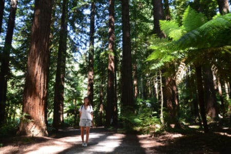 Im ca. 30 Minuten entfernten Rotorua gibt es neben dem gleichnamigen See noch den wunderschönen Redwood Forest zu entdecken. Die riesigen roten Sequoia Bäume, die man eigentlich aus Kalifornien kennt, ebnen hier den Weg zur Aussicht auf den Pohutu Geysir. Diesen Geheimtipp fanden wir in unserem Boomerang Reisen Tourenmanual.