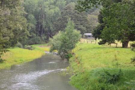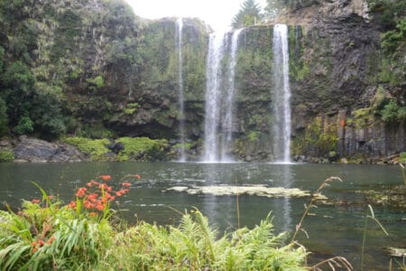 Eigentlich wollten wir anschließend einem der Strände entlang der Matakana Coast einen Besuch abstatten und unsere Bäuche noch mal gen Sonne strecken. Aber leider hat uns zum ersten Mal auf der Nordinsel das das Wetter nicht so ganz in die Karten gespielt. So mussten wir unsere Pläne kurzfristig ändern. Den angebrochenen Tag wollten wir nun zu einem Zwischenstopp bei den Whangarei Falls nutzen – wieder mal ein nützlicher Tipp aus unserem Boomerang Reisen Tourenmanual. Ein schöner kurzer Rundweg führt an mehreren kleineren Aussichtsplattformen vorbei zum Fuße der Wasserfälle. Von dort hat man einen tollen Blick auf das hinabstürzende Wasser. Wir nutzten die schöne Aussicht für eine Snackpause, bevor wir dann unsere Fahrt Richtung Bay of Islands fortsetzten.