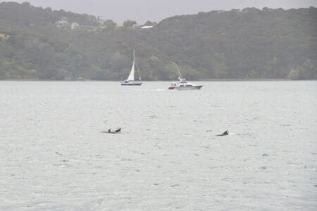 Nachdem das Boot sicher aus dem Hafen von Paihia ausgelaufen ist, wartete bereits das erste Highlight auf uns. In der Nähe eines vor Anker liegenden Kreuzfahrtschiffes tummelte sich eine Delfin Familie. Diese hatte bei dem leichten Wellgang sichtlich ihren Spaß und begleitete uns für einige Minuten. Eigentlich wäre das der ideale Zeitpunkt für das zweite Highlight unserer gebuchten Tour gewesen: Schwimmen zusammen mit den tierischen Meeresbewohnern. Jedoch machte uns die Crew direkt darauf aufmerksam, dass zwei Delfin Babies mit von der Partie waren. Das machte das gemeinsame Plantschen leider unmöglich, da es für die kleinen Tiere zu viel Stress bedeuten würde. Aufgrund der etwas stürmischen See und des nicht allzu sommerlichen Wetters waren wir aber eigentlich auch ganz froh darüber.