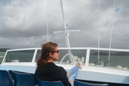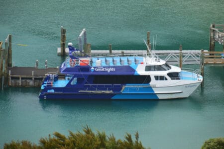 Morgens wartete dann bereits das Boot von Fullers Great Sights auf uns. Dies sollte ein sicherer Begleiter durch den etwas stürmischeren Tag in den Bay of Islands werden. Auch wenn es für die Region sicherlich nötig war, war es für uns schade, genau den ersten Regentag seit Weihnachten erwischt zu haben. Der gebuchte Cream Trip war aber trotz des bescheidenen Wetters ein voller Erfolg. Letztendlich war es auch gar nicht so schlimm und wir können die Tour auch bei Regen uneingeschränkt empfehlen.