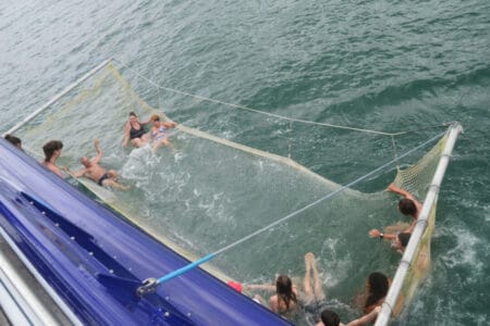 Auf dem Rückweg zum Hafen von Paihia bot sich uns noch mal die Möglichkeit beim „Boom-netting“ ins kühle Nass zu hüpfen. Dabei wird entlang der Seite des Bootes ein riesen Netz gespannt, in das man sich reinsetzen oder legen kann. Mit kurzen Manövern sorgt der Kapitän dann für Badespaß vom Feinsten. Man wird ähnlich in einer Waschmaschine im wahrsten Sinne des Wortes durchgeschüttelt. Auch trotz der durchkommenden Sonne war es uns doch noch ein wenig zu frisch für den Spaß und wir ließen den abgehärteten Engländern lieber den Vortritt. Aber auch aus trockener Entfernung war es witzig mit anzusehen. Alles in allem bietet der Cream Trip mit Fullers Great Sights wirklich eine tolle Möglichkeit einen Tag komplett in die wunderschönen Bay of Islands abzutauchen und die Landschaft hautnah zu erleben.