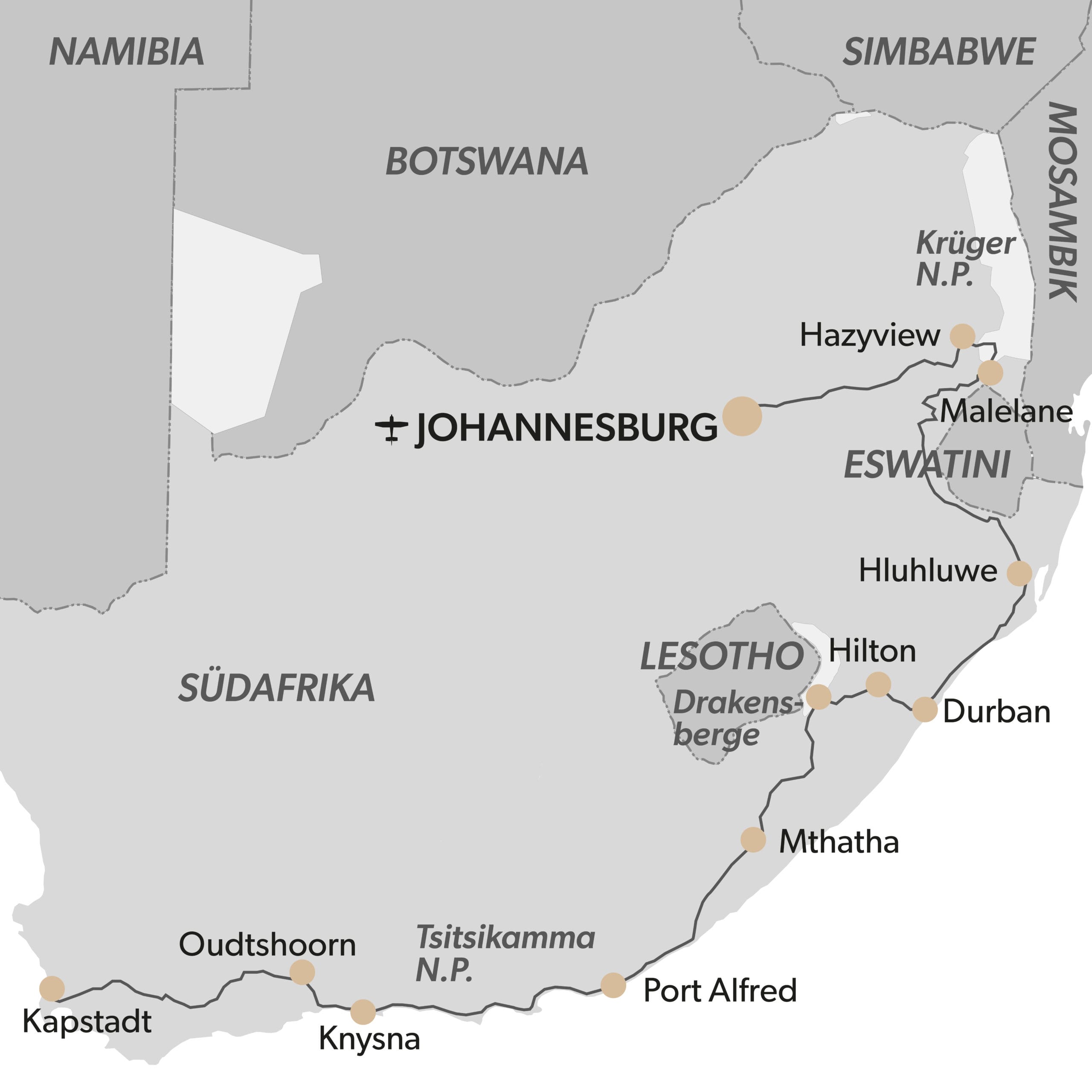 Entdecken Sie auf dieser kompakten Gruppenreise von Johannesburg bis Kapstadt die ganze Vielfalt von Südafrika mit Krüger-Nationalpark, iSimangaliso Wetland Park, Drakensberge, Wild Coast und Garden Route. Das tolle ist, dass Sie zahlreiche optionale Ausflüge und Aktivitäten gleich mit zu Ihrer Reise als Ausflugspaket mit hinzubuchen können. Somit haben Sie die freie Wahl, ob Sie es lieber etwas entspannter oder aktiver gestalten möchten.